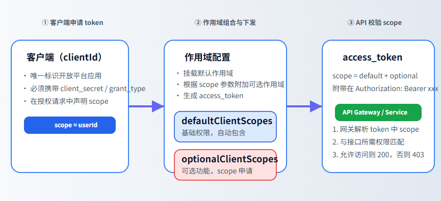 clientId和client_secret和grant_type获取access_token access_token中包含该客户端的所有作用域信息- 调用 API 接口时,服务器会验证 token 中的作用域是否包含该接口所需的权限